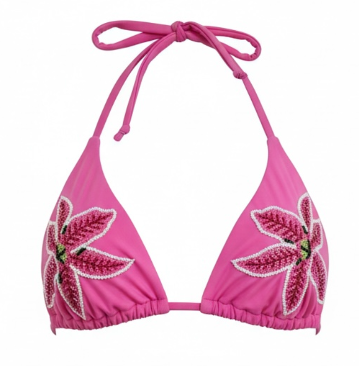 The Anastaysia Top is a true triangle top with ties around neck and back for perfect adjustability. The base is a bright fuchsia color with tonal dark pink beading to create the Hawaiian Lily shape.